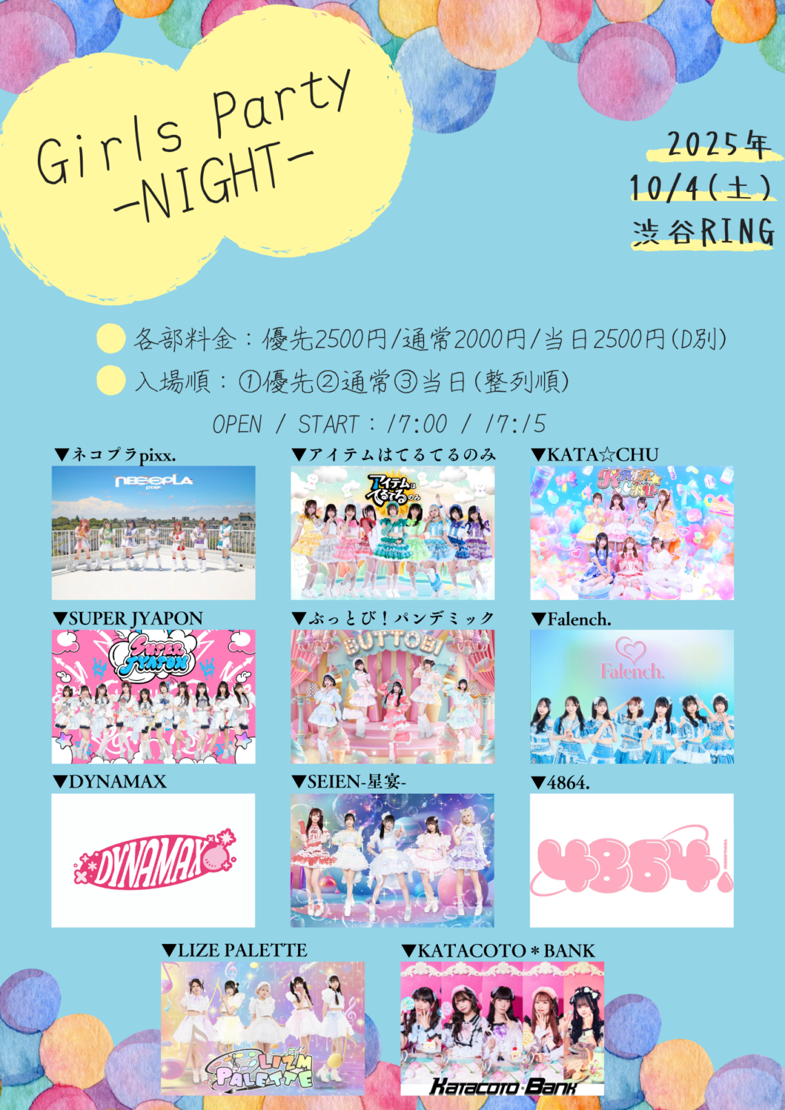 ▼出演:ネコプラpixx.、アイテムはてるてるのみ、4864.、ぶっとび!パンデミック、Falench.、DYNAMAX、SUPER JYAPON、KATACOTO*BANK、KATA☆CHU、LIZM PALETTE、SEIEN-星宴-
